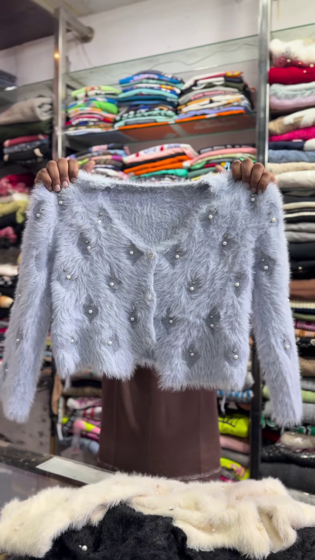 Step into winter like a star with this pearl galaxy furry crop cardigan collection, made for those who love their cozy layers with a glamorous twist. The ultra-soft faux-fur knit wraps you in a warm, cloud-like hug, while the cropped silhouette keeps the look modern, playful, and flattering over high‑waisted jeans, skirts, or dresses. Available in dreamy ivory, smoky black, and frosty grey-blue, each colour offers its own mood—from angelic and sweet to bold and mysterious. ❄️